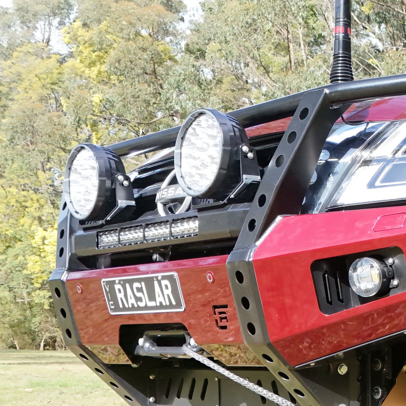 - Hooped (Dallas) Bull Bar – providing unmatched frontal protection and a clean factory-style finish in Desert Red. It’s colour coded to tie perfectly into the Patrol’s bodywork, while offering serious strength for animal strikes and winch integration.