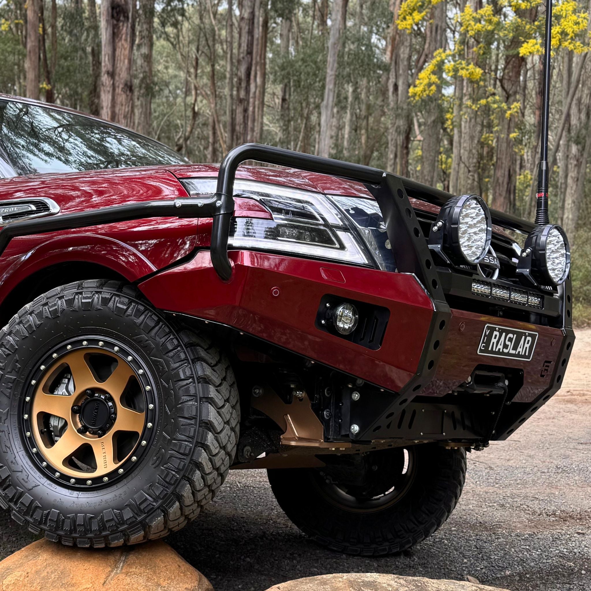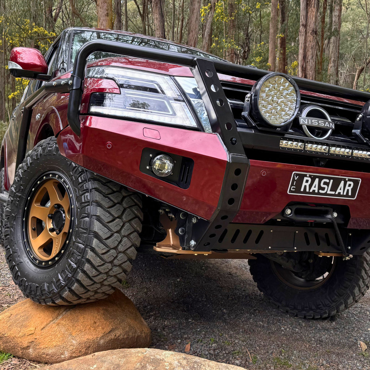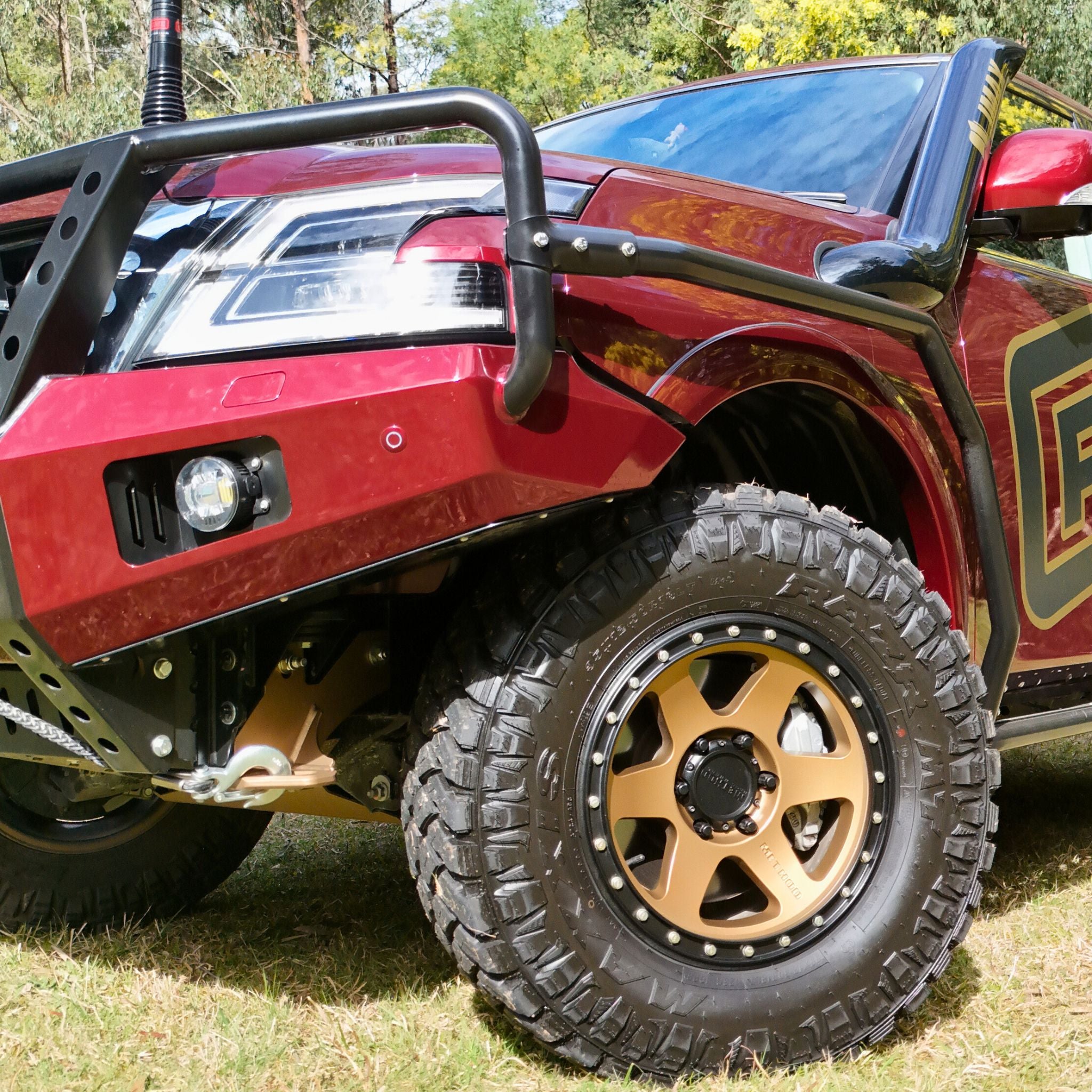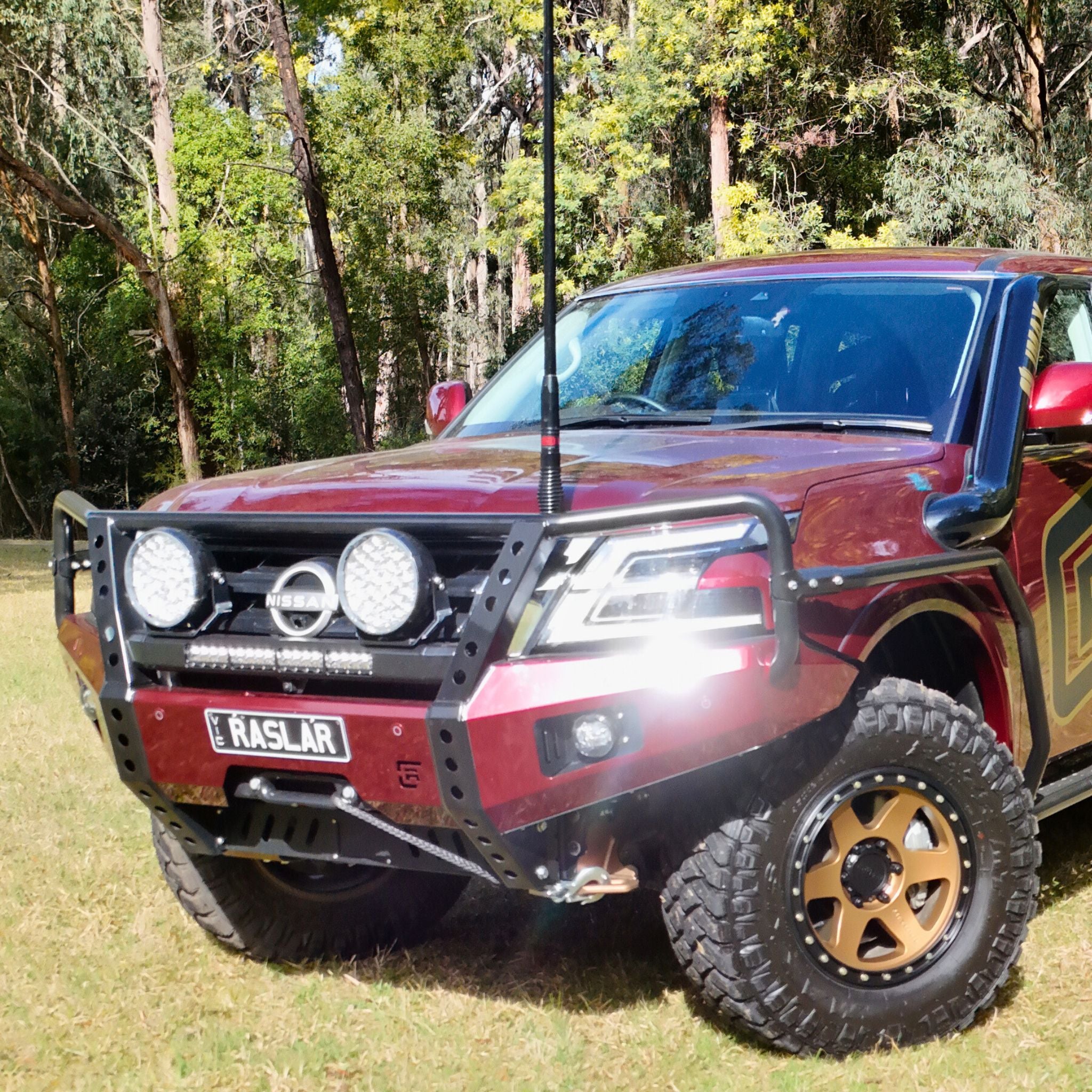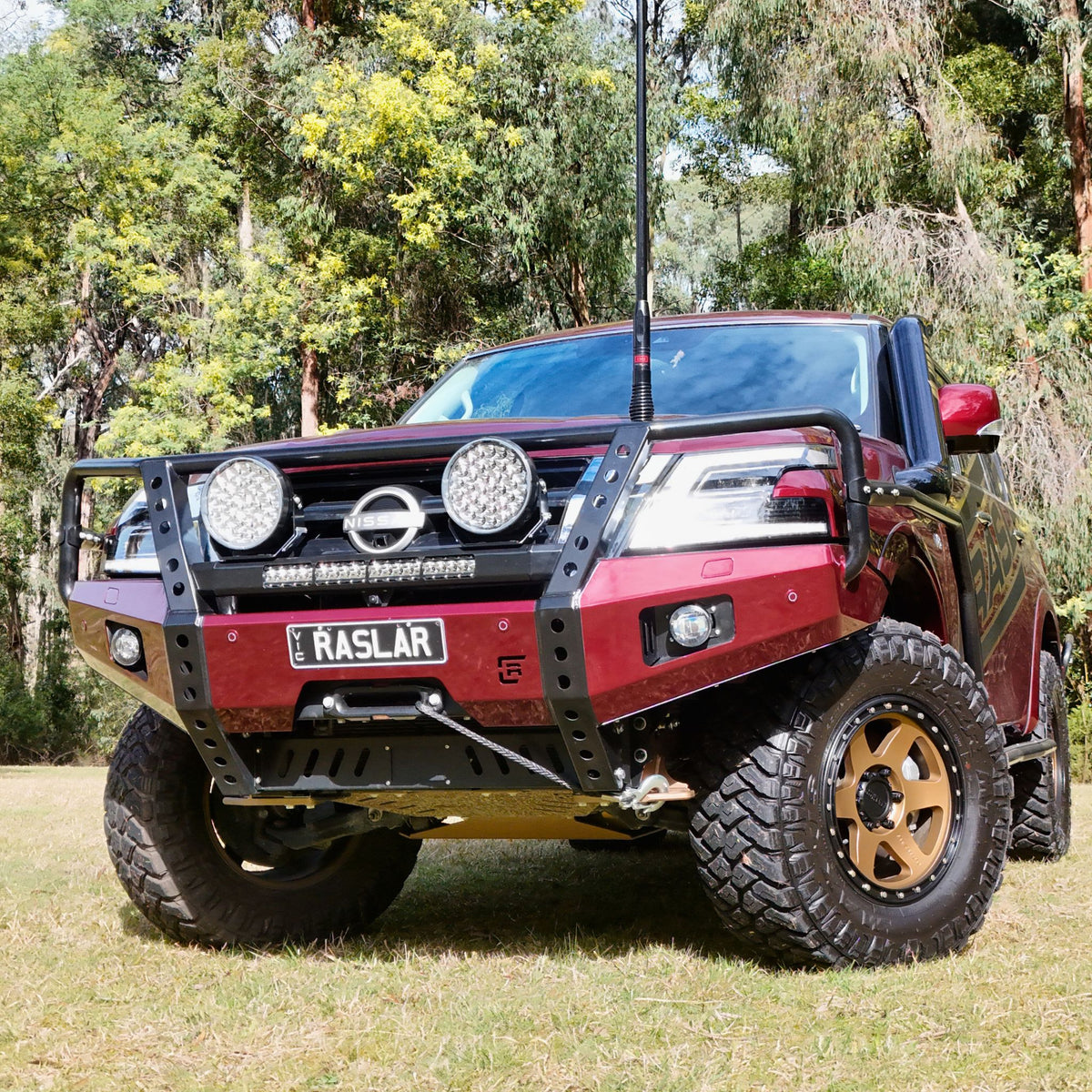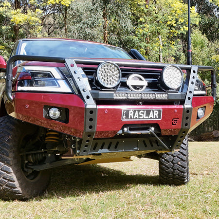 As standard when painting the bull bars, the centre divider remains powdered black whilst the rest of the bar is colour coded to suit your vehicle. (White vehicle in images).